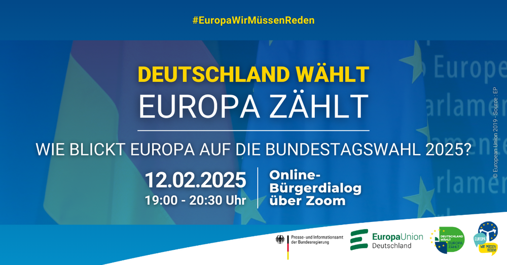 Herzliche Einladung zu unserem Online-Bürgerdialog "Deutschland wählt, Europa zählt! Wie blickt Europa auf die Bundestagswahl 2025?" am 12. Februar 2025.