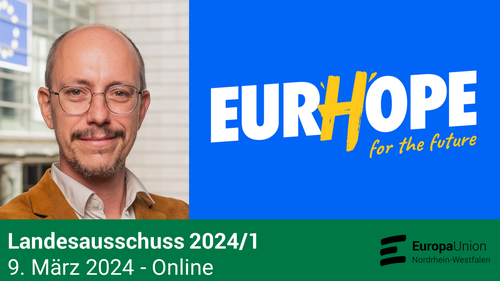 Am 9. März kamen die Delegierten zum ersten Landesausschuss der Europa-Union NRW im Jahr 2024 zusammen. Das wichtigste Thema war unser Startschuss zur aktiven Phase der EurHope-Kampagne, welche bis zur Europawahl am 9. Juni das zentrale Projekt des Landesverbandes ist. Hierzu war als besonderer Gast Christian Beck aus dem Bundespräsidium für einen Vortrag zugeschaltet.
