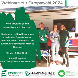 Jetzt geht es in die heiße Phase vor der Europawahl. Bei unserer digitalen verbands:stoff-Akademie am 24. April um 19 Uhr machen wir uns fit für die inhaltlichen Diskussionen und Gespräche bei Aktionen, Infoständen und Veranstaltungen. Nachdem wir uns bei einem Webinar mit der Gesprächsführung an sich befasst haben, geht es jetzt um Fakten und inhaltliche Argumente, die für die EU sprechen. Dabei wollen wir einen besonderen Blick auf die Themenkomplexe Klima und Energie, Asyl und Migration, Wirtschaft und Währung sowie Bürokratie…