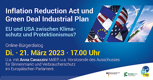 Bringen Sie Ihre Anliegen und Fragen ein bei unserem ersten Online-Bürgerdialog des Jahres 2023! Diskutieren Sie am 21. März von 17:00 bis 18:30 Uhr zum Thema „Inflation Reduction Act und Green Deal Industrial Plan – EU und USA zwischen Klimaschutz und Protektionismus?“ mit Anna Cavazzini MdEP, Vorsitzende des Ausschusses für Binnenmarkt und Verbraucherschutz im Europäischen Parlament, Thomas Eibl, Referent in der Abteilung für Wirtschaftspolitik der Wirtschaftskammer Österreich, und Daniel Sahl-Corts, Geschäftsführer Hauptstadtbüro…