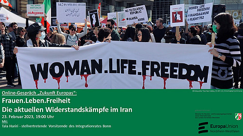 Am 23.02.2023 um 19:00 Uhr laden wir ein zur Zoom-Konferenz: Unter dem Motto "Frauen.Leben.Freiheit" sind verschiedene Gruppen in mehreren Städten NRWs aktiv. Sie führen uns ein in das politische System und seine Geschichte nach der sogenannten "Islamischen Revolution 1979". Sie berichten über die aktuelle Situation, wie es zu den heutigen revolutionären Verhältnissen kommen konnte und wie der Weg in eine freiheitliche und demokratische Zukunft gestaltet werden könnte.