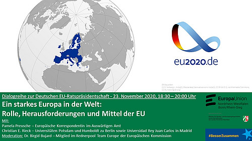 Gemeinsam mit der Europa-Union Bonn/Rhein-Sieg lädt die Europa-Union NRW im Rahmen der Projektreihe zur deutschen EU-Ratspräsidentschaft am 23. November von 18:30-20:00 Uhr zu einer Online-Debatte ein. Gäste sind Pamela Preusche, Europäische Korrespondentin im Auswärtigen Amt und Christian E. Rieck, Universitäten Potsdam und Humboldt zu Berlin sowie Universidad Rey Juan Carlos in Madrid, die Moderation übernimmt Dr. Birgit Bujard, Mitglied im Rednerpool Team Europe der Europäischen Kommission.