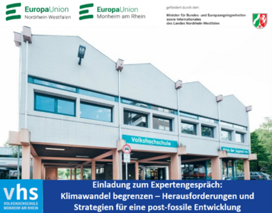 Am Mittwoch, dem 07. Oktober lädt die Europa-Union Monheim von 19 bis 21 Uhr herzlich zu einer offenen Diskussionsrunde in der Volkshochschule Monheim am Rhein, Tempelhofer Str. 13, ein. Die Vortrags- und Diskussionsveranstaltung wird von Herrn Professor Dr. Peter Hennicke geleitet und ist ein Teil der Dialogreihe zur deutschen Ratspräsidentschaft. Professor Dr. Peter Hennicke ist Träger des Deutschen Umweltpreises und Mitglied im Club of Rome. Darüber hinaus war er Präsident des Wuppertal Instituts für Klima, Umwelt und Energie.