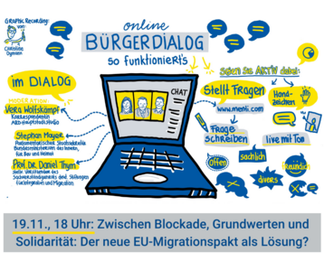 Bei bereits elf erfolgreichen Online-Bürgerdialogen und vielen kleineren dezentralen Formaten in den letzten Monaten nutzten eine Vielzahl von Teilnehmenden die Gelegenheit, sich zu aktuellen europapolitischen Themen mit unseren hochkarätigen Experten im direkten Dialog auszutauschen. Für die kommenden Wochen stehen jetzt die Themen Asyl- und Migrationspolitik am 19. November und Demokratie und Rechtsstaatlichkeit am 3. Dezember auf unserer Agenda. Jetzt hier anmelden und mitdiskutieren!
