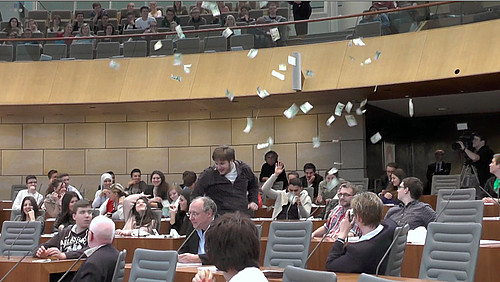"Wir sind Europa - Wir haben die Wahl" - unter diesem Motto kamen am Europatag 350 Erstwählerinnen und Erstwähler im NRW-Landtag zusammen. Mit "Poledance" bei der Aufführung der "Euro-WG" im Plenarsaal hatten die Jugendlichen dabei sicher nicht gerechnet.